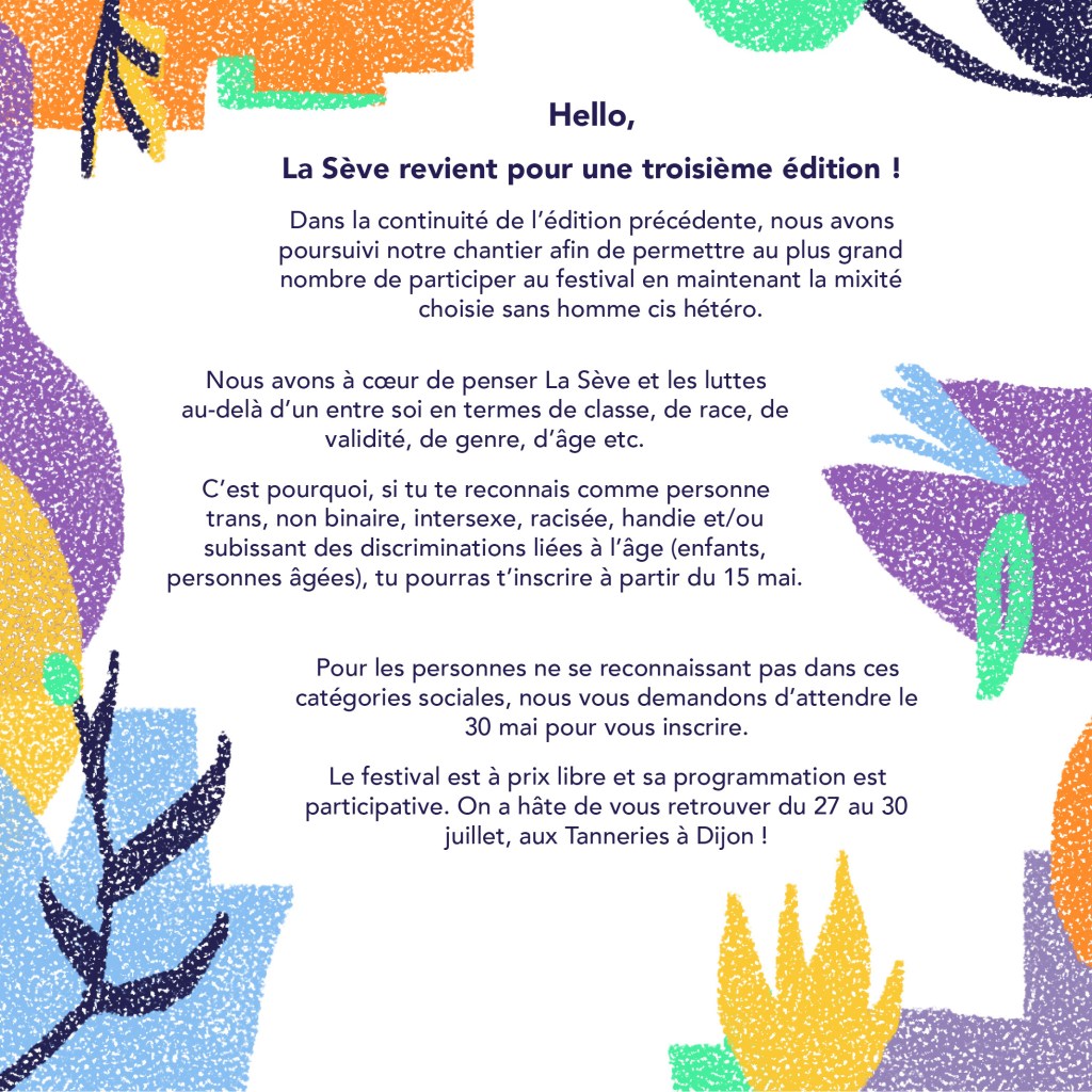 Nous remercions du fond du cœur toutes les personnes qui ont permis de près ou de loin de faire exister La Sève : les lieux qui nous ont accueilli•es, les maraîcher•es et les boulanger•es qui nous ont nourri•es, celleux qui nous ont fourni•es du matériel, celleux qui sont passé•es par l’orga pour 1,2,3 éditions, et bien sûr toustes les participant•es.