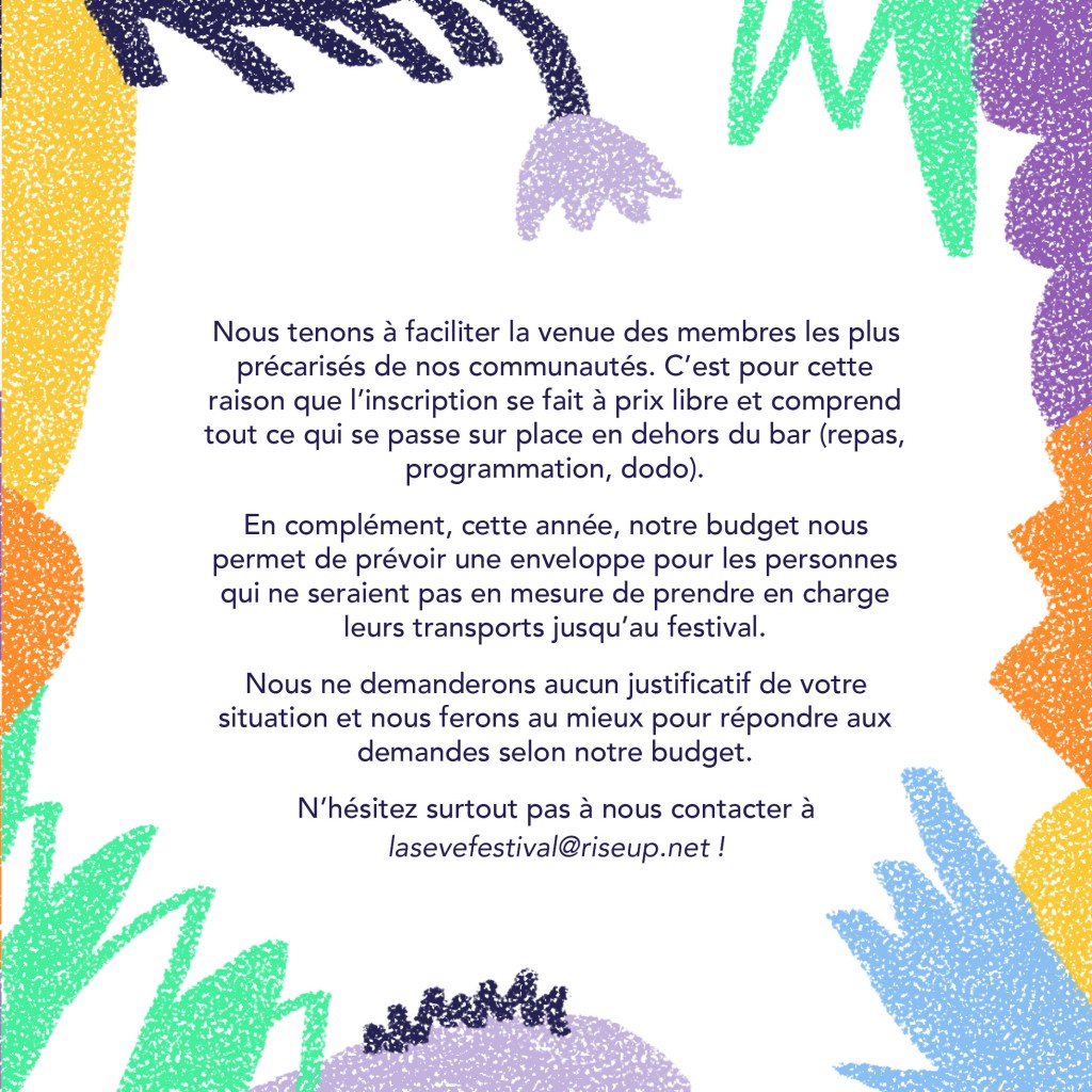 Le festival est à prix libre. Nous tenons à faciliter la venue des membres les plus précarisés de nos communautés. Ce prix libre comprend tout ce qui se passe sur place en dehors du bar (repas, programmation, dodo).